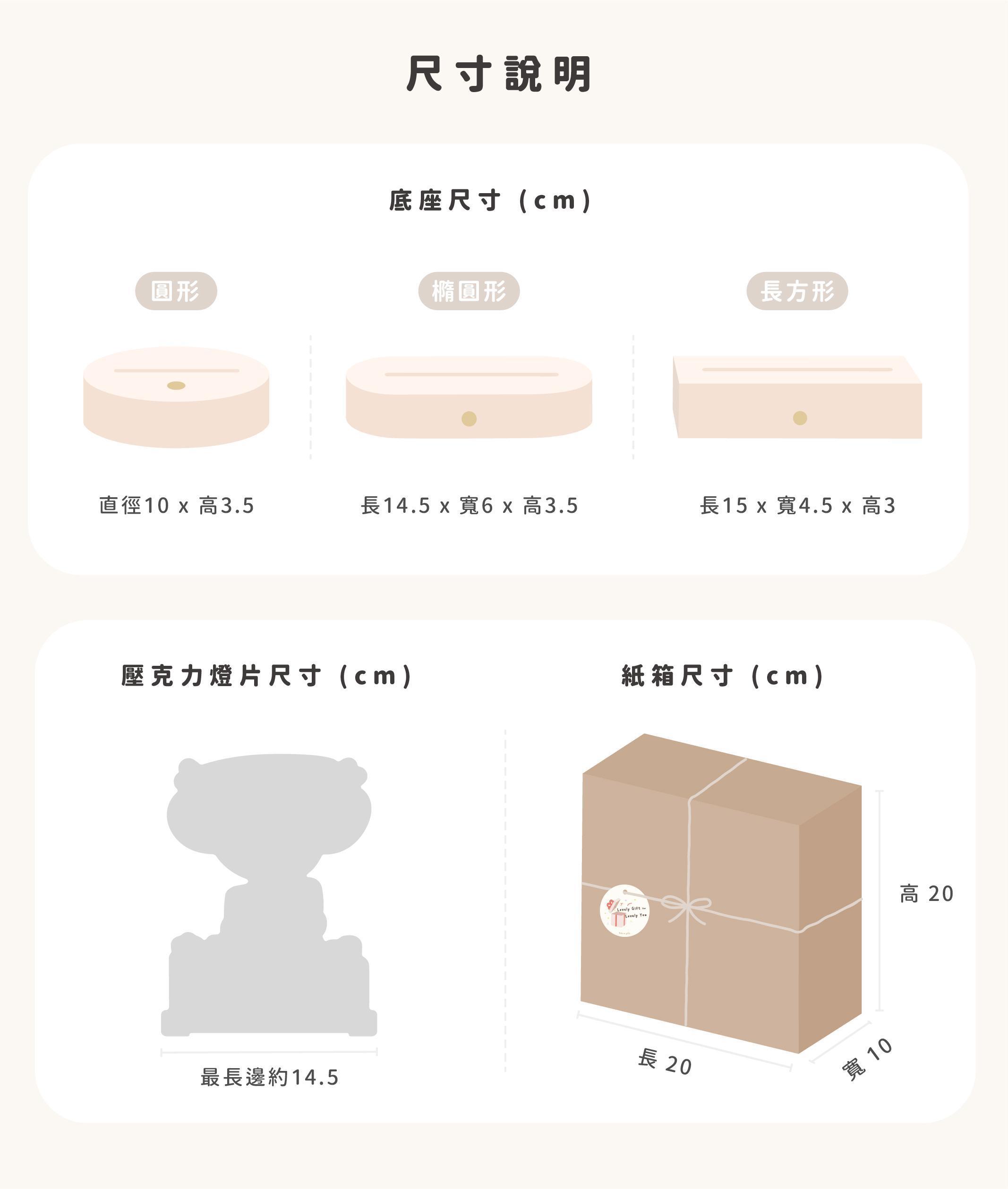 • 橢圓形底座:長 14.5,寬 6,高度 3.5 cm